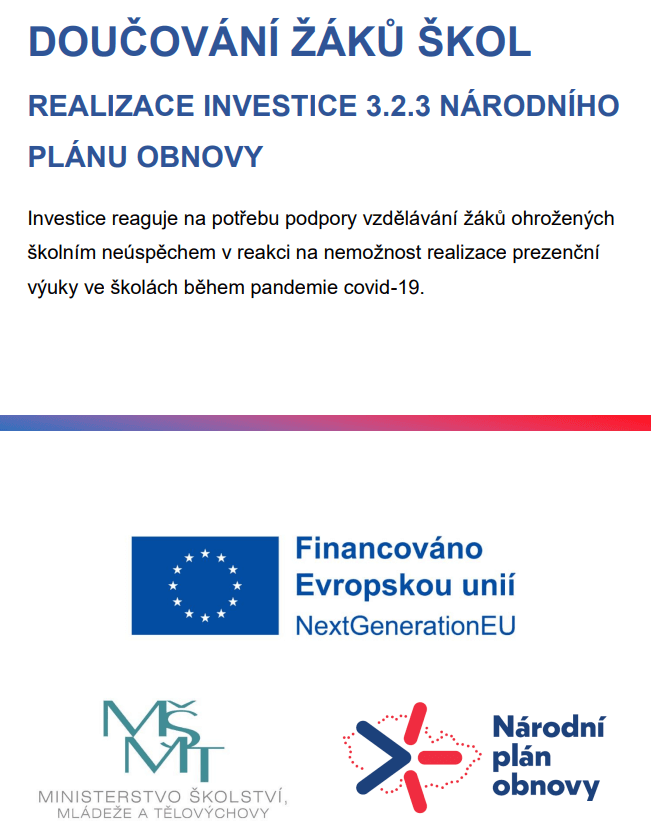 a) žije v prostředí, kde není dlouhodobě dostatečně podporováno k přípravě na vzdělávání (například z důvodu nedostatečného materiálního zázemí, nevyhovujících bytových podmínek, časové náročnosti dopravy do školy, nezájmu ze strany zákonných zástupců, konfliktů v rodině), b) žije v prostředí sociálně vyloučených lokalit nebo lokalit sociálním vyloučením ohrožených, c) je znevýhodněn z důvodu příslušnosti k etnické nebo národnostní skupině či specifickému sociálnímu prostředí, zejména je-li znevýhodnění spojeno s nedostatečnou znalostí vyučovacího jazyka, z důvodu používání odlišného jazyka nebo specifické formy vyučujícího jazyka v domácím prostředí žáka.Doučování probíhá individuálně i skupinově v kterémkoliv předmětu, ať už v průběhu letních prázdnin (např. pro splnění opravných zkoušek) nebo od začátku školního roku, a to osobně i online. Formu a čas domluvíme podle individuálních potřeb žáka.